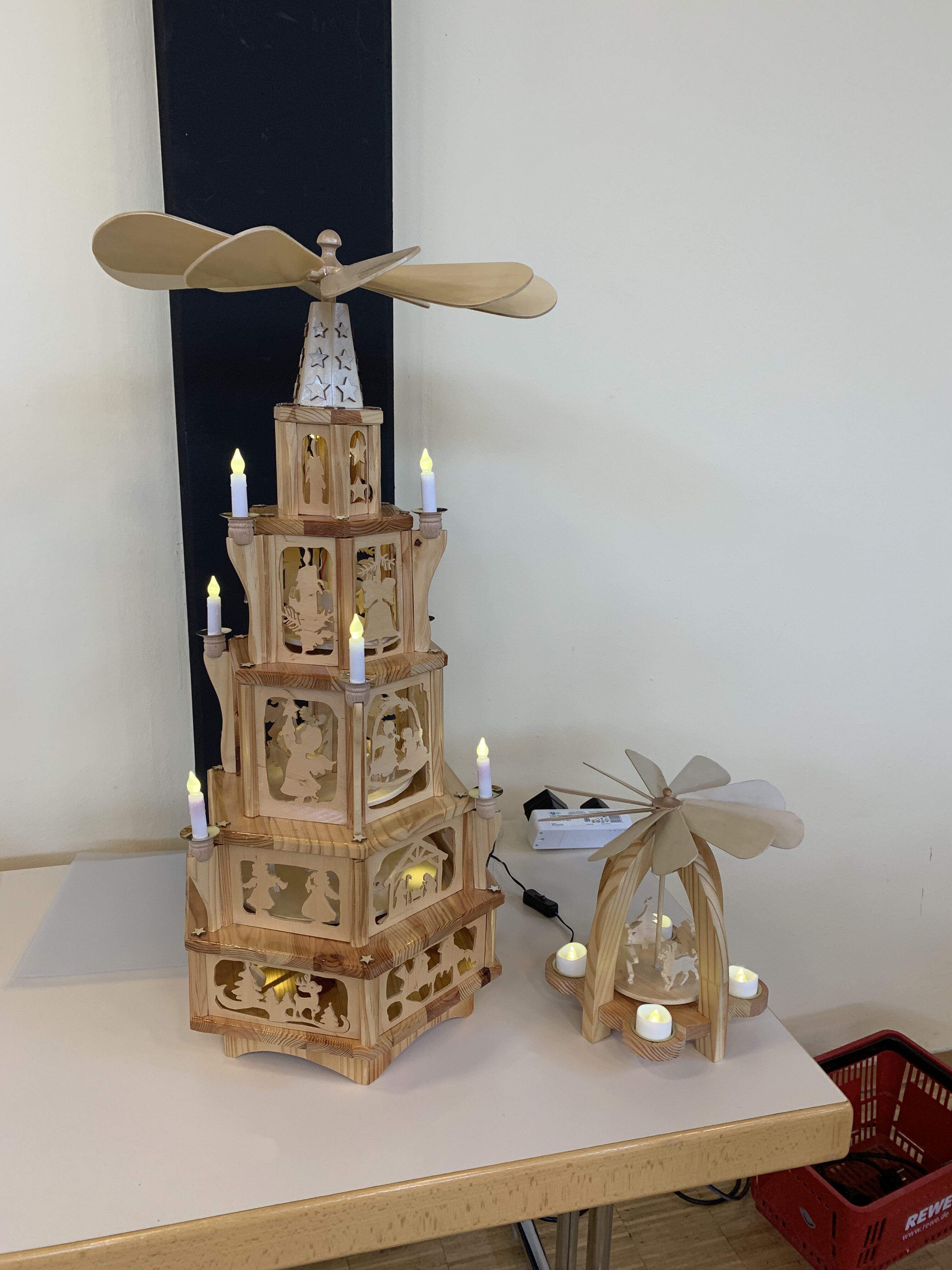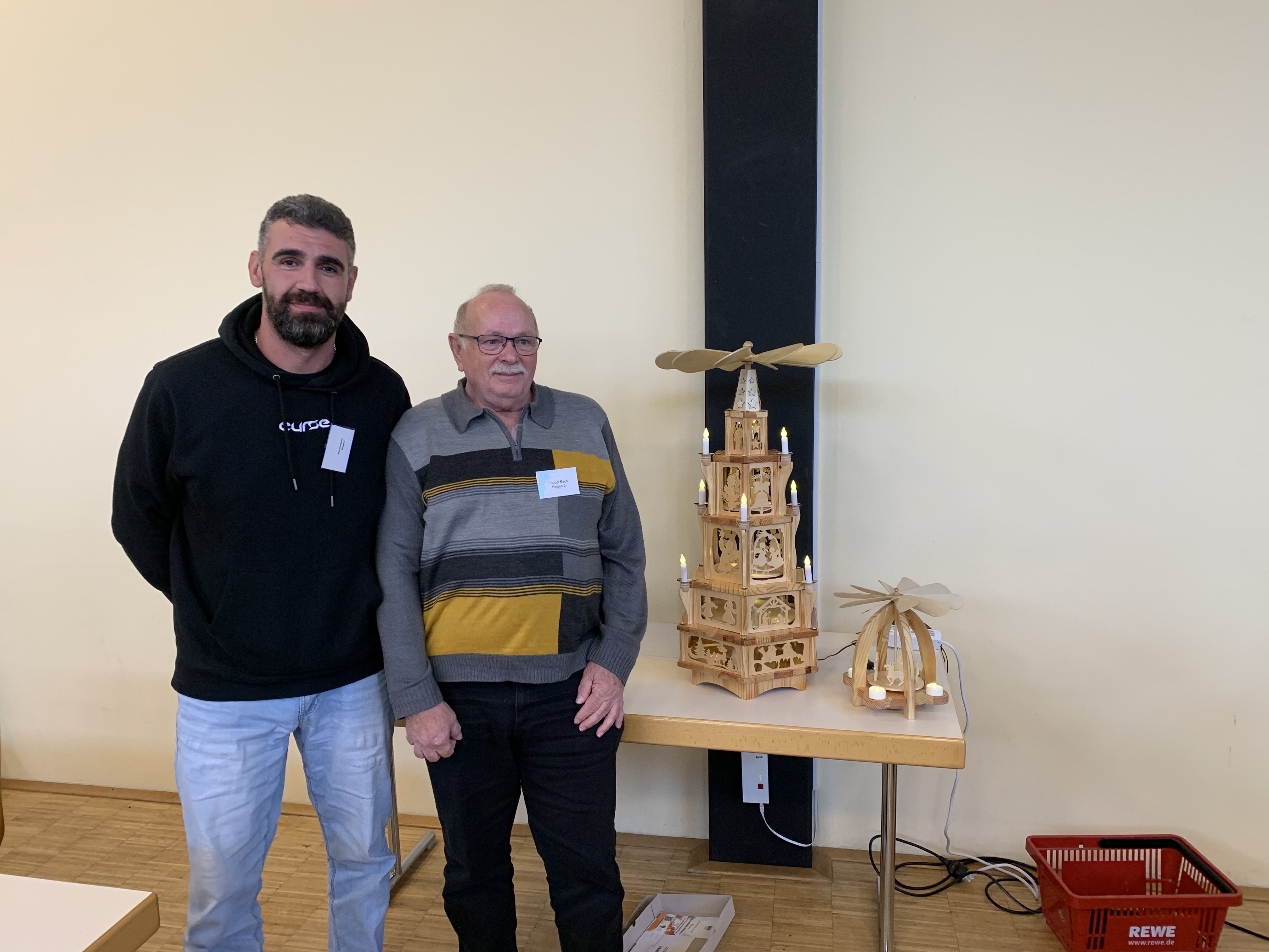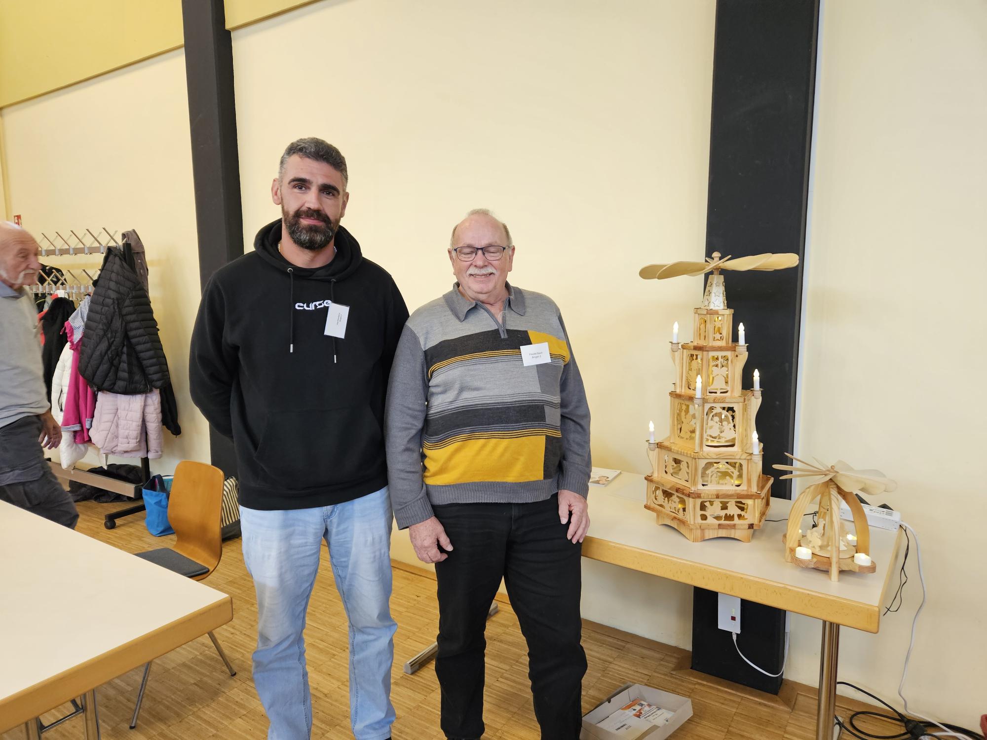 Zum Abschluss dieser lebendigen Veranstaltung wurde eine Weihnachtspyramide versteigert, die unser Friedel Bach in seiner Holzwerkstatt gebaut hat. Die Pyramide ging für einen Erlös von 300 € an Joao Pombeiro aus Bingen. Die Versteigerungssumme stiftete Friedel Bach der KB Stiftung. Wir danken ihm sehr herzlich dafür.