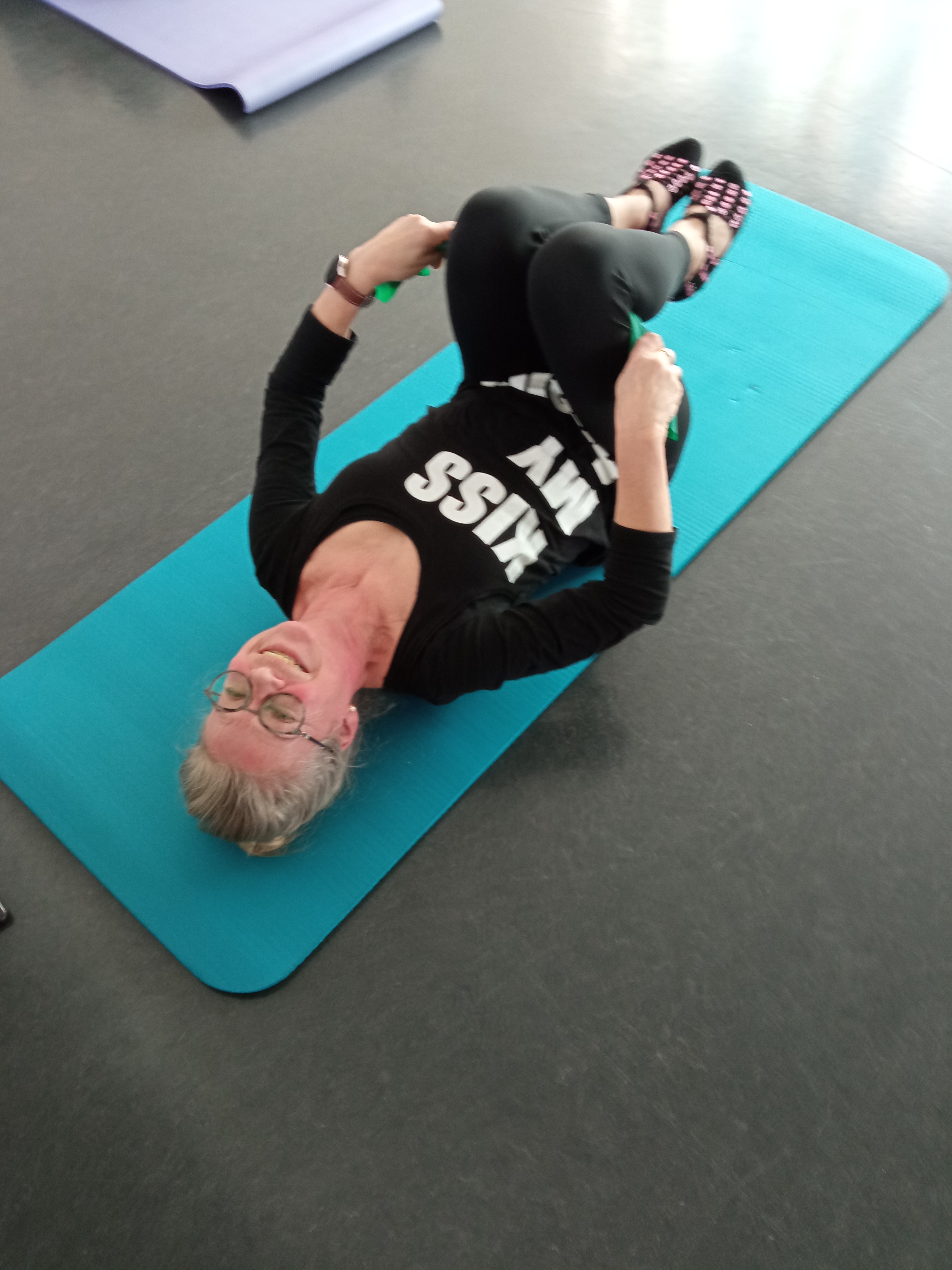 Nach einer leckeren Suppe zum Mittagessen holte Sigrid ihre nächste Überraschung für uns raus – in Form von Therabändern! Wir Teilnehmer versuchten (teils vergeblich!) die Übungen, die Sigrid so leicht vorführte, elegant nachzumachen.